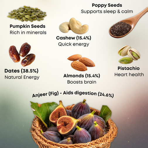 | Ingredients | Anjeer, Dates, Almonds, Cashews, Pistachios, Pumpkin Seeds, Poppy Seeds |