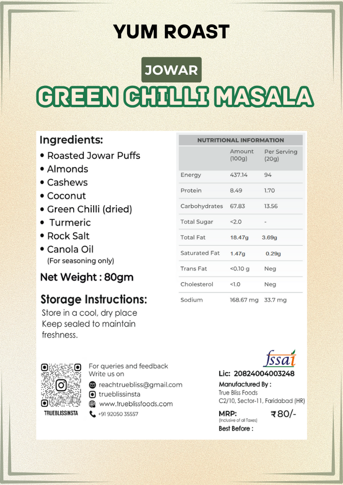 | Ingredients | Roasted Jowar Puffs, Green Chilli (Dried), Cashews, Almonds, Peanuts, Coconut, Turmeric, Black Gram (Chana), Rock Salt, Canola Oil |