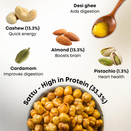 | Ingredients | Sattu, Almonds, Cashews, Pistachios, Jaggery, Desi Ghee |