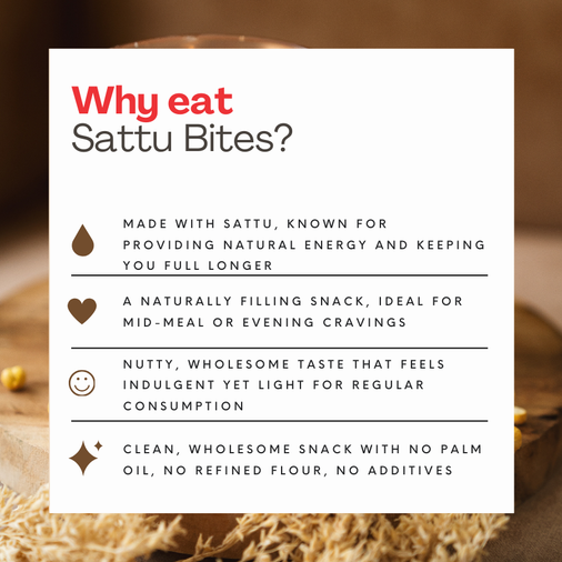 A power-packed, protein-rich bite made with roasted sattu, jaggery, and high quality dry fruits and nuts for sustained energy